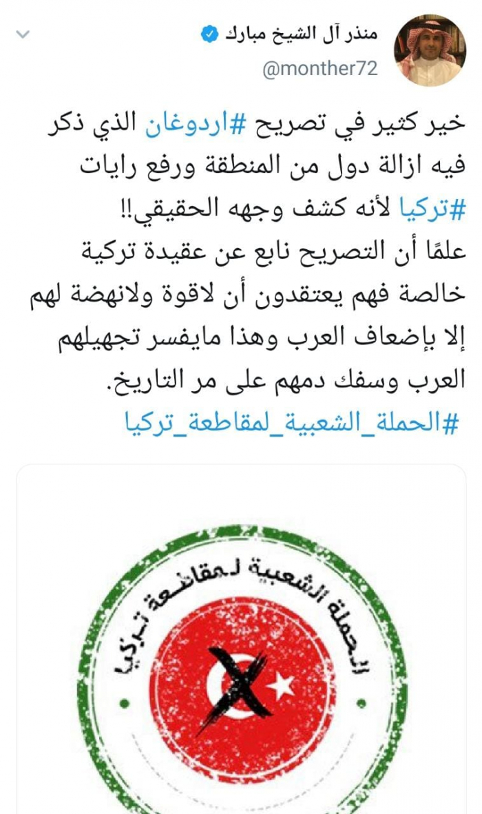 وكتب آل شيخ المبارك عبر تغريدة له على "تويتر" رصدها " المشهد العربي": "خير كثير في تصريح أردوغان الذي ذكر فيه إزالة دول من المنطقة ورفع رايات تركيا لأنه كشف وجهه الحقيقي".