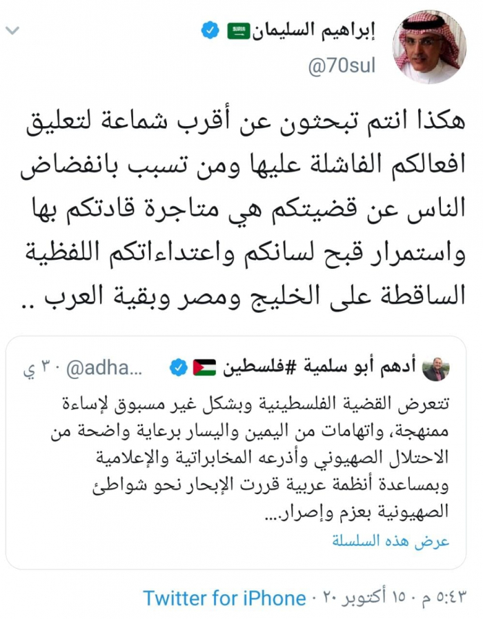 السليمان يجلد مغرد فلسطيني.. ويكشف سبب انفضاض الناس عن قضيتهم