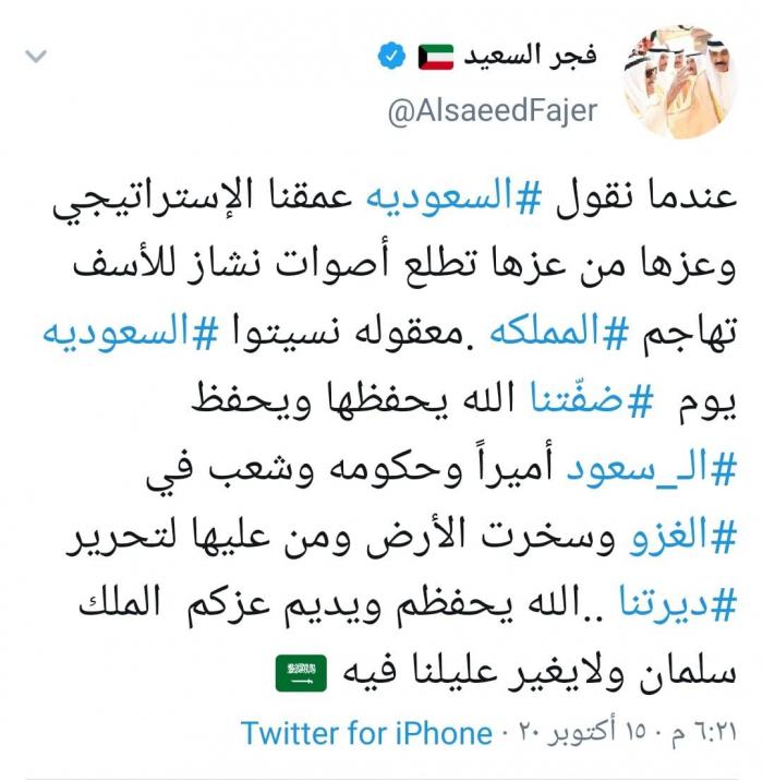 وكتبت السعيد عبر تغريدة لها على" تويتر" رصدها " المشهد العربي": "عندما نقول السعودية عمقنا الاستراتيجي وعزها من عزها تطلع أصوات نشاز للأسف تهاجم المملكة".