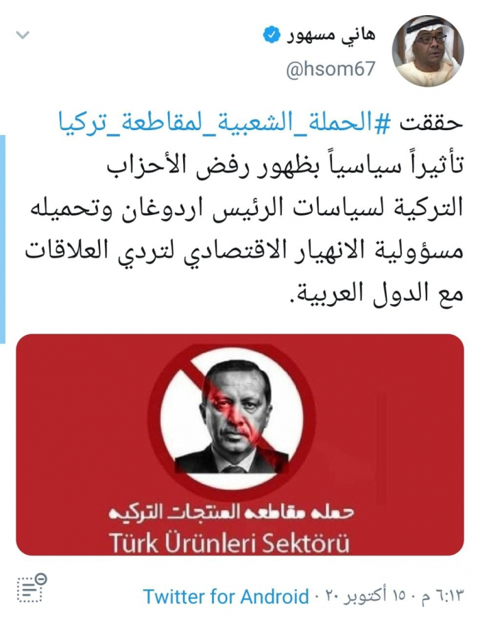 وكتب مسهور في تغريدة له على "تويتر" رصدها " المشهد العربي":" حققت الحملة الشعبية لمقاطعة تركيا تأثيراً سياسياً بظهور رفض الأحزاب التركية لسياسات الرئيس أردوغان".