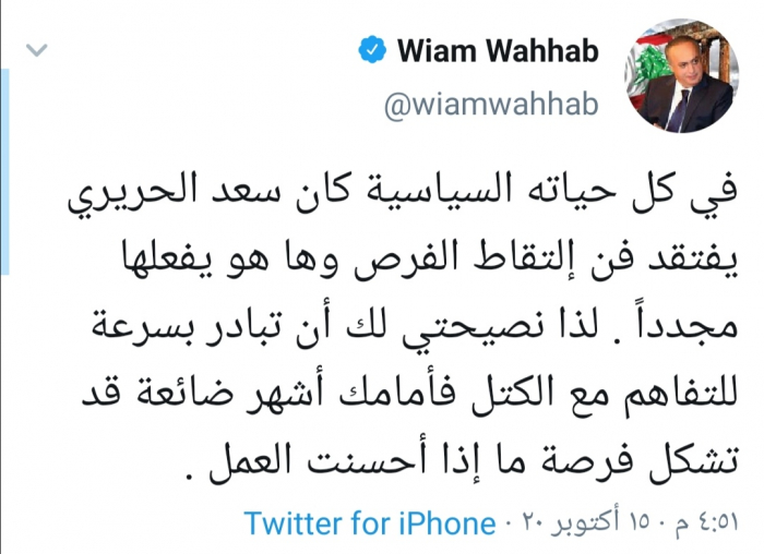وقال وهاب في تغريدة له عبر "تويتر" رصدها "المشهد العربي": "في كل حياته السياسية كان سعد الحريري يفتقد فن إلتقاط الفرص وها هو يفعلها مجدداً".