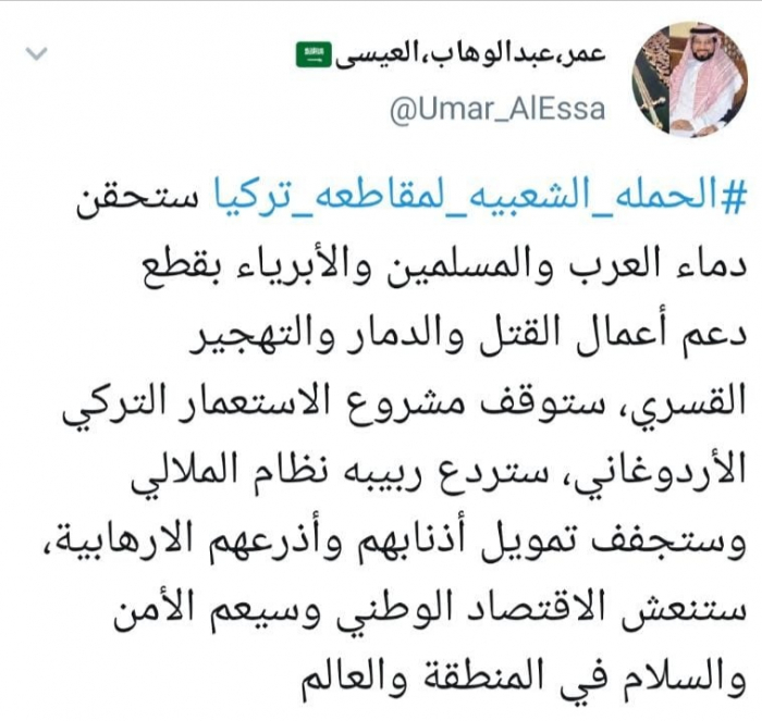 أكد الكاتب والمحلل السياسي السعودي عمر عبدالوهاب العيسى، اليوم الخميس، أن دعم الحملة الشعبية لمقاطعة تركيا ستوقف مشروع الاستعمار التركي الأردوغاني.