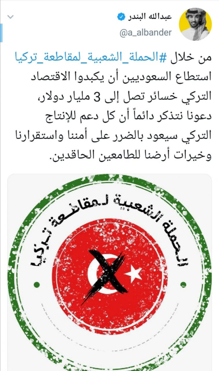 أكد الإعلامي السعودي عبدالله البندر، أن حملة مقاطعة المنتجات التركية التي تبنتها السعودية كبدت الاقتصاد التركي خسائر تصل إلى 3 مليار دولار.