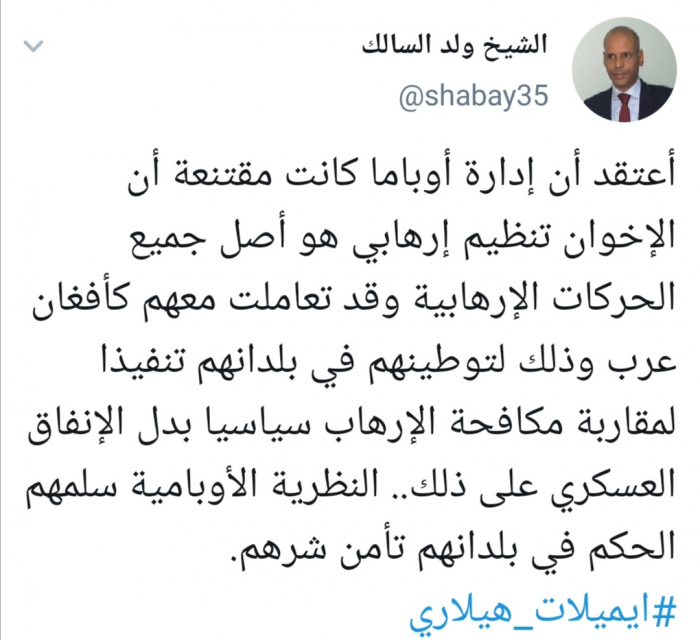 وقال ولد السالك في تغريدة له عبر حسابه بتويتر ورصدها "المشهد العربي" : "أعتقد أن إدارة أوباما كانت مقتنعة أن الإخوان تنظيم إرهابي هو أصل جميع الحركات الإرهابية وقد تعاملت معهم كأفغان عرب وذلك لتوطينهم في بلدانهم تنفيذا لمقاربة مكافحة الإرهاب سياسيا بدل الإنفاق العسكري على ذلك".
