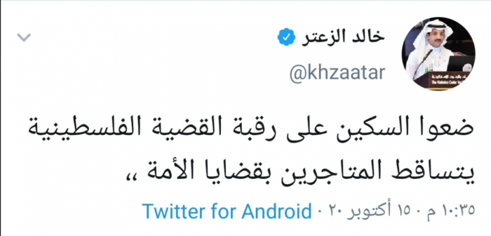 وكتب الزعتر عبر تغريدة له على "تويتر" رصدها "المشهد العربي": "ضعوا السكين على رقبة القضية الفلسطينية يتساقط المتاجرين بقضايا الأمة".