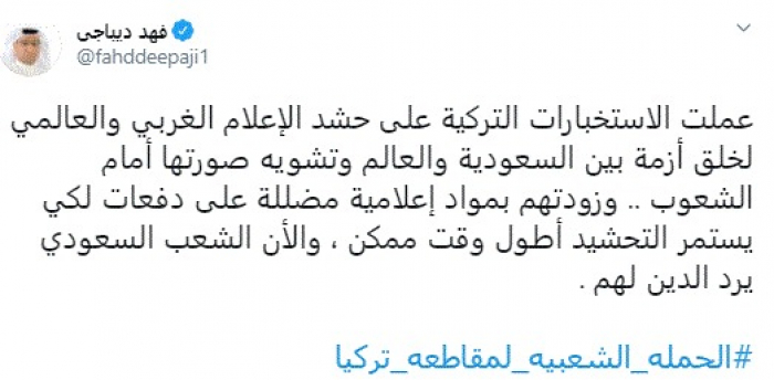 وكتب في تغريدة عبر "تويتر" رصدها "المشهد العربي": "عملت الاستخبارات التركية على حشد الإعلام الغربي والعالمي لخلق أزمة بين السعودية والعالم وتشويه صورتها أمام الشعوب.. وزودتهم بمواد إعلامية مضللة على دفعات لكي يستمر التحشيد أطول وقت ممكن، والآن الشعب السعودي يرد الدين لهم".