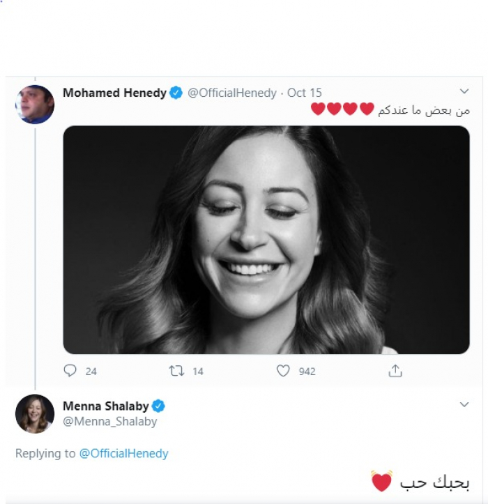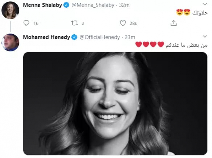 وعلقت منة شلبى على الصورة مازحة، وتغزلت فيها قائلة: "حلاوتك"، ثم رد عليها هنيدى "من بعض ما عندكم"، مع إضافة آخر صورة قامت بنشرها عبر حسابها على "إنستجرام" وهى تضحك وهنا ردت منة "بحبك حب".