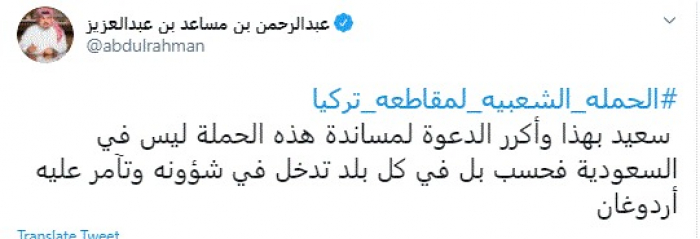 وقال في تغريدة عبر "تويتر" رصدها "المشهد العربي": "الحملة الشعبية لمقاطعة تركيا سعيد بهذا وأكرر الدعوة لمساندة هذه الحملة ليس في السعودية فحسب بل في كل بلد تدخل في شؤونه وتآمر عليه أردوغان".