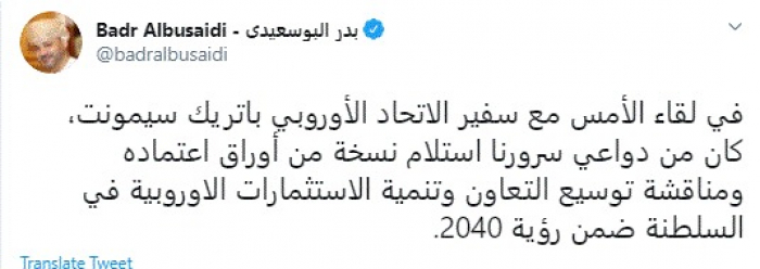 وقال في تغريدة عبر "تويتر" رصدها "المشهد العربي": "في لقاء الأمس مع سفير الاتحاد الأوروبي باتريك سيمونت، كان من دواعي سرورنا استلام نسخة من أوراق اعتماده ومناقشة توسيع التعاون وتنمية الاستثمارات الأوروبية في السلطنة ضمن رؤية 2040".