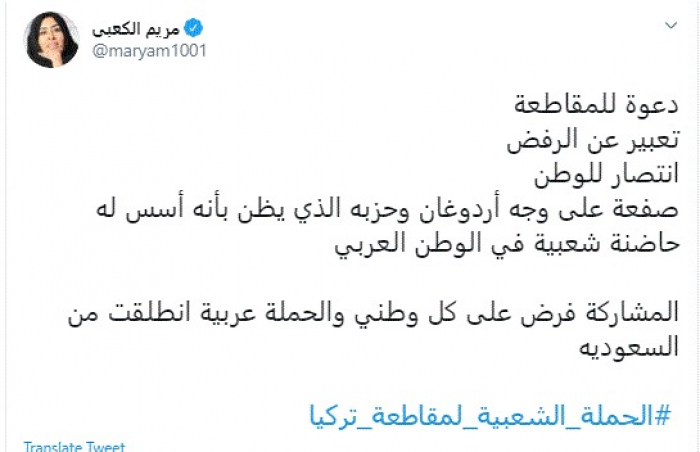 وكتبت في تغريدة عبر "تويتر" رصدها "المشهد العربي": "دعوة للمقاطعة تعبير عن الرفض انتصار للوطن صفعة على وجه أردوغان وحزبه الذي يظن بأنه أسس له حاضنة شعبية في الوطن العربي المشاركة فرض على كل وطني والحملة عربية انطلقت من السعودية".
