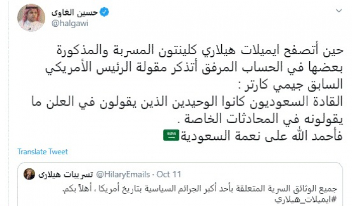 وقال في تغريدة عبر "تويتر" رصدها "المشهد العربي": "حين أتصفح إيميلات هيلاري كلينتون المسربة والمذكورة بعضها في الحساب المرفق أتذكر مقولة الرئيس الأمريكي السابق جيمي كارتر: القادة السعوديون كانوا الوحيدين الذين يقولون في العلن ما يقولونه في المحادثات الخاصة. فأحمد الله على نعمة السعودية".
