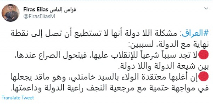وقال في تغريدة عبر "تويتر" رصدها "المشهد العربي": "العراق: مشكلة اللا دولة أنها لا تستطيع أن تصل إلى نقطة نهاية مع الدولة، لسببين: لا تجد سبباً شرعياً للإنقلاب عليها، فيتحول الصراع عندها، بين شيعة الدولة واللا دولة".