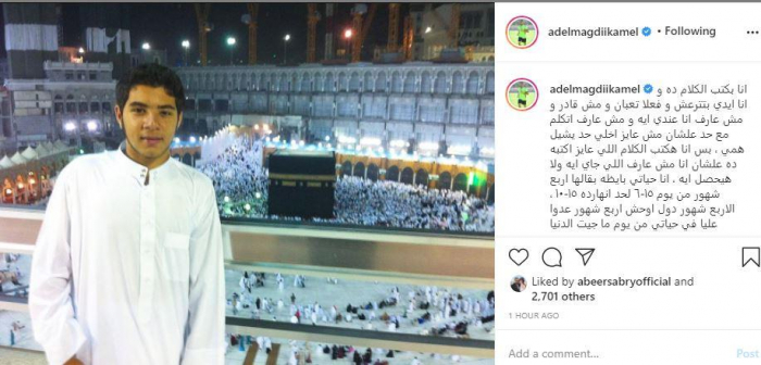 وكتب عادل تعليقًا على صورته من أمام الكعبة "أنا بكتب الكلام ده وأنا إيدي بتترعش وفعلا تعبان ومش قادر، ومش عارف أنا عندي إيه، ومش عارف أتكلم مع حد علشان مش عايز أخلي حد يشيل همي، بس أنا هكتب الكلام اللي عايز أكتبه ده علشان أنا مش عارف اللي جاي إيه ولا هيحصل إيه، أنا حياتي بايظة بقالها 4 شهور من يوم ١٥-٦ لحد النهاردة ١٥-١٠".