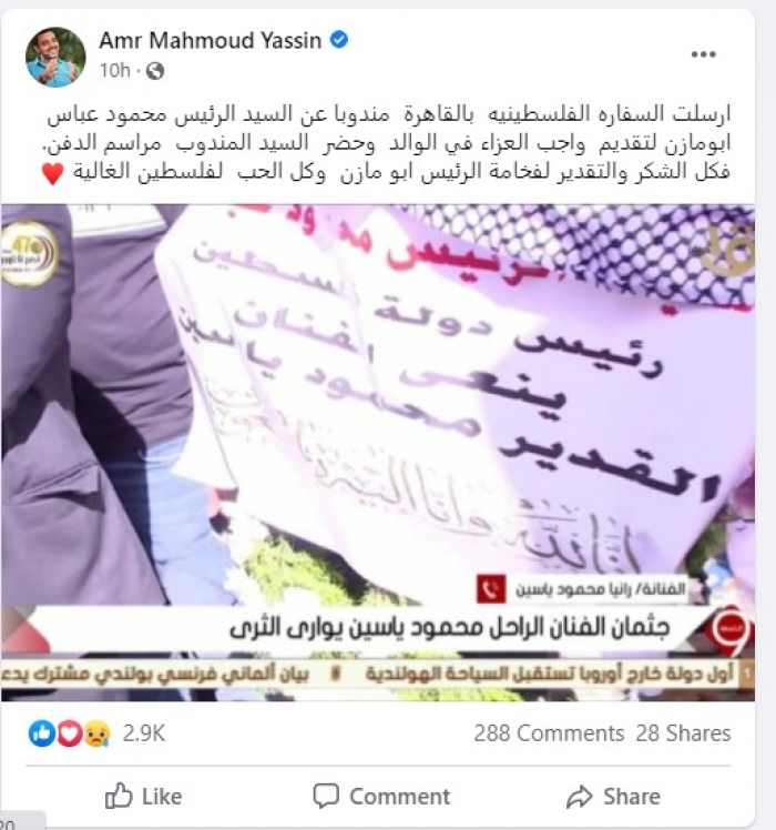 ونشر عمرو صورة إكليل الزهور الذي أرسلته السفارة، عبر حسابه الشخصي على موقع "فيسبوك"، معلقًا "أرسلت السفارة الفلسطينية بالقاهرة مندوبا عن السيد الرئيس محمود عباس أبومازن، لتقديم واجب العزاء في الوالد وحضر السيد المندوب مراسم الدفن. فكل الشكر والتقدير لفخامة الرئيس أبو مازن وكل الحب لفلسطين الغالية".