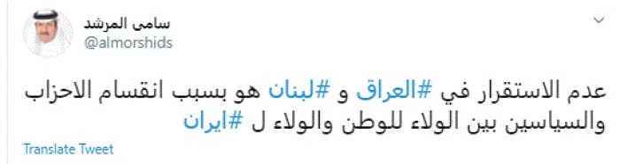 وقال في تغريدة عبر "تويتر" رصدها "المشهد العربي": "عدم الاستقرار في العراق ولبنان هو بسبب انقسام الأحزاب والسياسين بين الولاء للوطن والولاء لإيران".