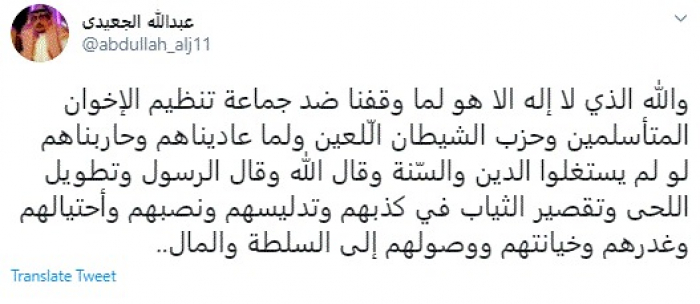 وكتب في تغريدة عبر "تويتر" رصدها "المشهد العربي": "والله الذي لا إله الا هو لما وقفنا ضد جماعة تنظيم الإخوان المتأسلمين وحزب الشيطان الّلعين ولما عاديناهم وحاربناهم لو لم يستغلوا الدين والسّنة وقال الله وقال الرسول وتطويل اللحى وتقصير الثياب في كذبهم وتدليسهم ونصبهم وأحتيالهم وغدرهم وخيانتهم ووصولهم إلى السلطة والمال".