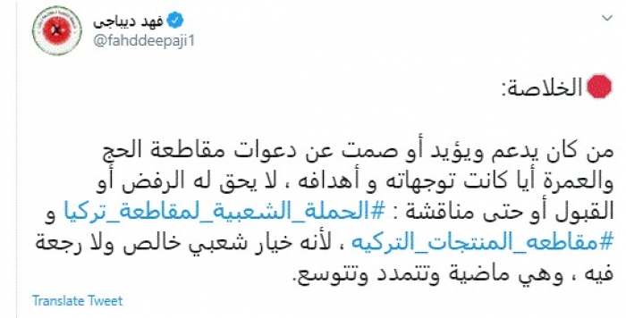 وكتب في تغريدة عبر "تويتر" رصدها "المشهد العربي": "الخلاصة.. من كان يدعم ويؤيد أو صمت عن دعوات مقاطعة الحج والعمرة أيا كانت توجهاته وأهدافه، لا يحق له الرفض أو القبول أو حتى مناقشة : الحملة الشعبية لمقاطعة تركيا ومقاطعة المنتجات التركية، لأنه خيار شعبي خالص ولا رجعة فيه، وهي ماضية وتتمدد وتتوسع".
