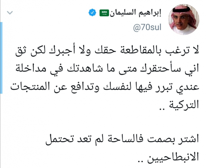 وكتب السليمان في تغريدة له عبر "تويتر" رصدها "المشهد العربي":"لا ترغب بالمقاطعة حقك ولا أجبرك لكن ثق إني سأحتقرك متى ما شاهدتك في مداخلة عندي تبرر فيها لنفسك وتدافع عن المنتجات التركية".