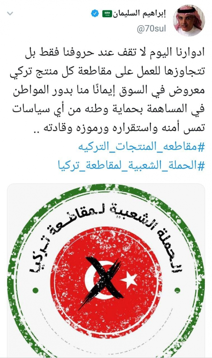 وكتب السليمان عبر تغريدة له على "تويتر" رصدها " المشهد العربي":"أدوارنا اليوم لا تقف عند حروفنا فقط بل تتجاوزها للعمل على مقاطعة كل منتج تركي معروض في السوق".