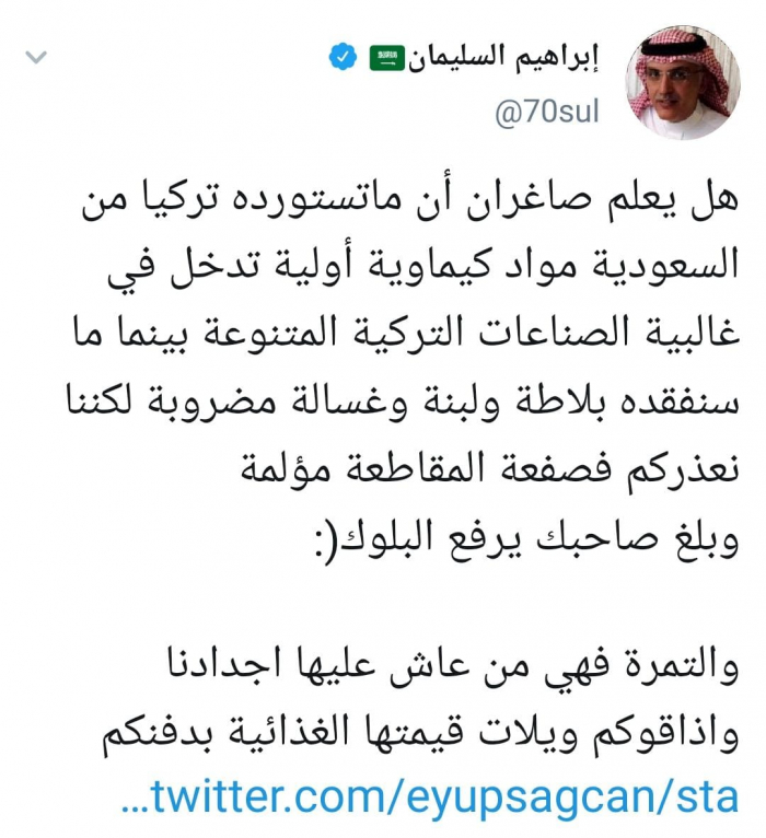 وتساءل السليمان عبر تغريدة له على "تويتر" رصدها " المشهد العربي":"هل يعلم صاغران أن ماتستورده تركيا من السعودية مواد كيماوية أولية تدخل في غالبية الصناعات التركية المتنوعة"؟.
