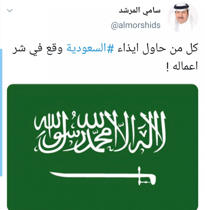 وقال المرشد في تغريدة له عبر حسابه بتويتر ورصدها "المشهد العربي": "كل من حاول إيذاء السعودية وقع في شر أعماله".