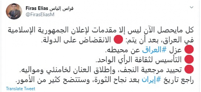 وقال في تغريدة عبر "تويتر" رصدها "المشهد العربي": "كل ما يحصل الآن ليس إلا مقدمات لإعلان الجمهورية الإسلامية في العراق، بعد أن يتم: الانقضاض على الدولة. عزل العراق عن محيطه. التأسيس لثقافة الرأي الواحد. تحييد مرجعية النجف، وإطلاق العنان لخامنئي ومواليه.