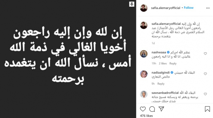 وكتبت العمري، عبر حسابها بموقع "إنستجرام": "إنا لله وإنا إليه راجعون.. أخويا الغالي في ذمة الله أمس.. نسأل الله أن يتغمده برحمته".