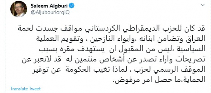 وقال في تغريدة عبر "تويتر" رصدها "المشهد العربي": "قد كان للحزب الديمقراطي الكردستاني مواقف جسدت لحمة العراق وتضامن أبنائه، وإيواء النازحين، وتقويم العملية السياسية".