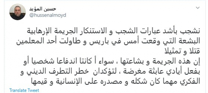 وكتب في تغريدة عبر "تويتر" رصدها "المشهد العربي": "نشجب بأشد عبارات الشجب والاستنكار الجريمة الإرهابية البشعة التي وقعت أمس في باريس وطالت أحد المعلمين قتلا وتمثيلا".