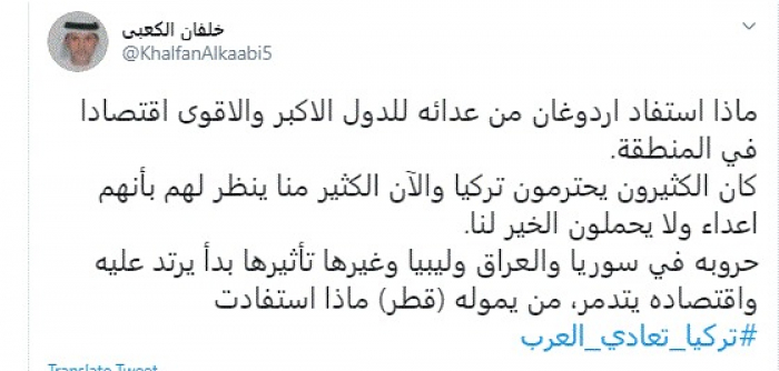 وقال في تغريدة عبر "تويتر" رصدها "المشهد العربي": "ماذا استفاد أردوغان من عدائه للدول الأكبر والأقوى اقتصادًا في المنطقة. كان الكثيرون يحترمون تركيا والآن الكثير منا ينظر لهم بأنهم أعداء ولا يحملون الخير لنا".