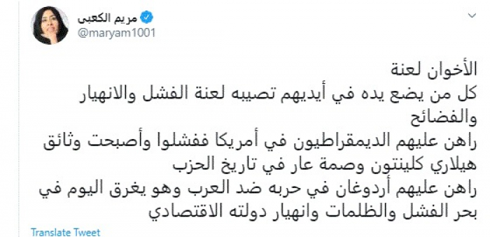 شنت الكاتبة والإعلامية الإماراتية مريم الكعبي، اليوم، هجومًا عنيفًا على تنظيم الإخوان، مؤكدةً أن كل من يتعاون معهم تصيبهم لعنة الفشل والانهيار.