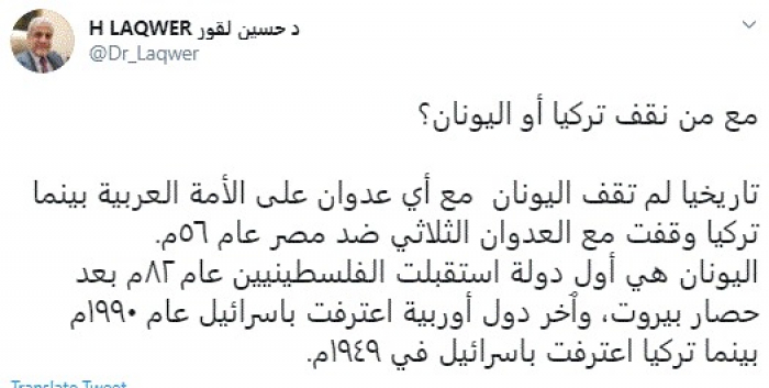وقال في تغريدة عبر "تويتر" رصدها "المشهد العربي": "مع من نقف تركيا أو اليونان؟ تاريخيا لم تقف اليونان مع أي عدوان على الأمة العربية بينما تركيا وقفت مع العدوان الثلاثي ضد مصر عام ٥٦م".