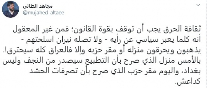 طالب الباحث السياسي العراقي مجاهد الطائي، اليوم، بوقف ثقافة الحرق التي تنتهجها المليشيات في العراق.