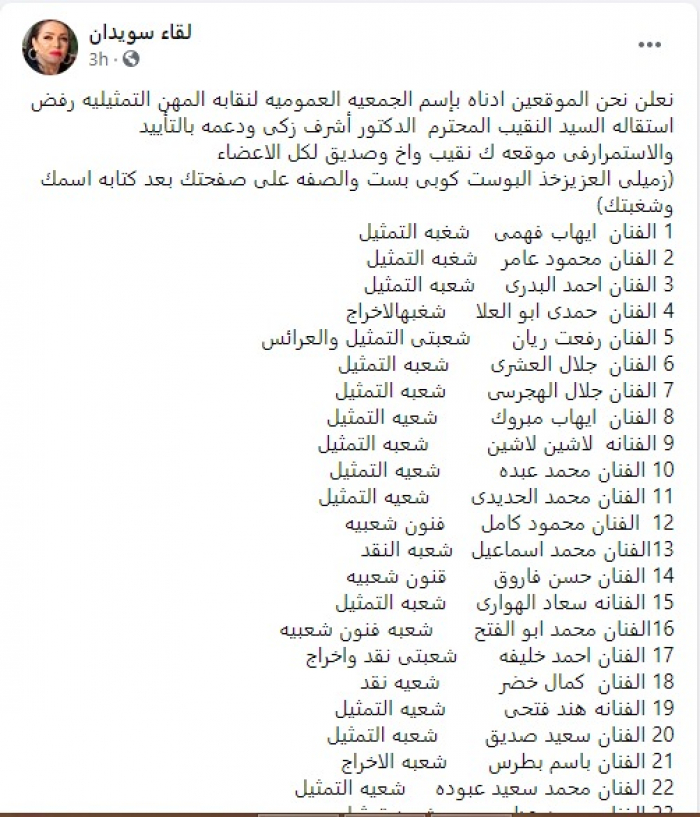 وكتبت لقاء سويدان، في منشورها على فيسبوك: «نعلن نحن الموقعين أدناه باسم الجمعية العمومية لنقابة المهن التمثيلية رفض استقالة السيد النقيب المحترم الدكتور أشرف زكى ودعمه بالتأييد والاستمرار في موقعه كنقيب وأخ وصديق لكل الأعضاء (زميلى العزيز خذ البوست كوبى بيست والصفة على صفحتك بعد كتابة اسمك و شعبتك)».