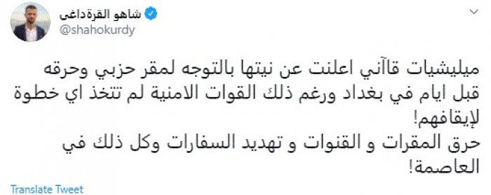 وقال في تغريدة عبر "تويتر" رصدها "المشهد العربي": "مليشيات قاآني أعلنت عن نيتها بالتوجه لمقر حزبي وحرقه قبل أيام في بغداد ورغم ذلك القوات الأمنية لم تتخذ أي خطوة لإيقافهم! حرق المقرات والقنوات وتهديد السفارات وكل ذلك في العاصمة".