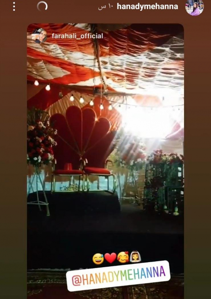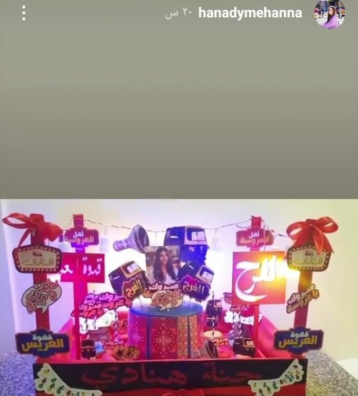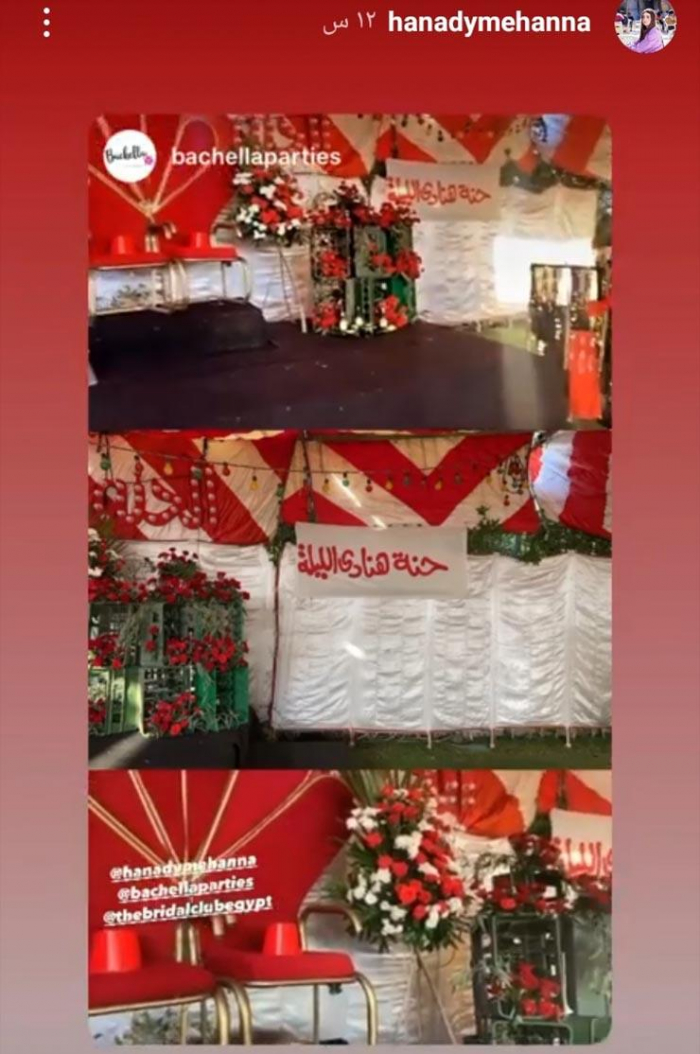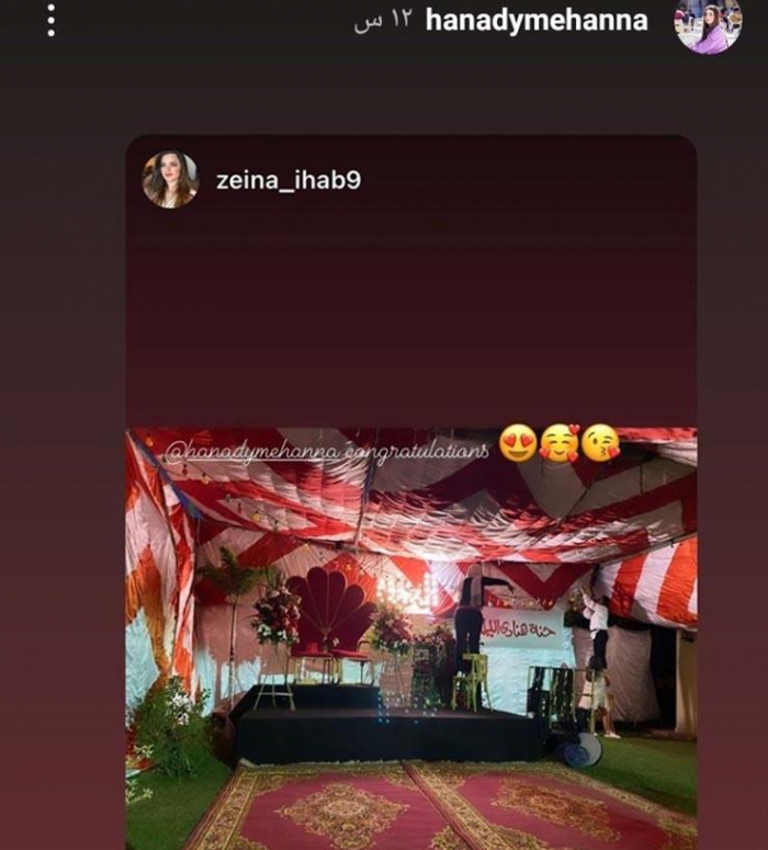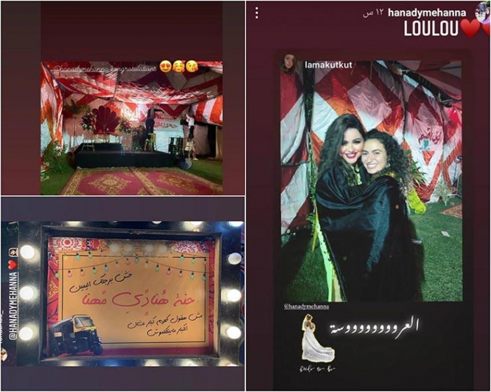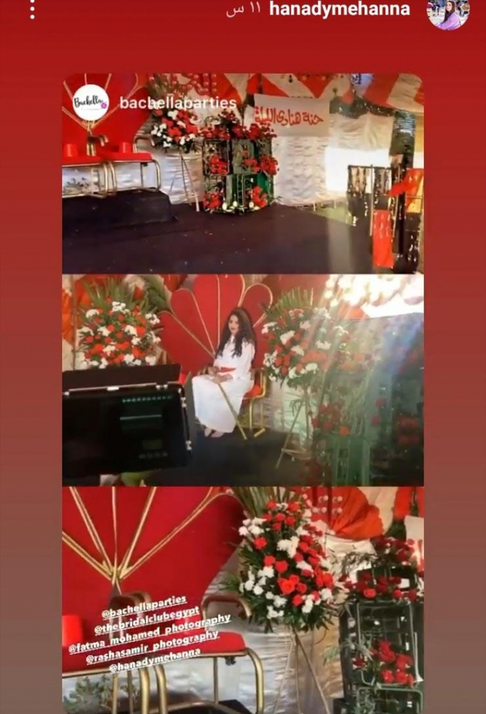 ونشرت هنادي، صورا من ليلة الحنة، عبر خاصية القصص القصيرة على حسابها بموقع إنستجرام، وتضمنت الصور تزيين المكان بأعمدة نور، و"توك توك" ولافتة مدون عليها "حنة هنادي مهنا" وأخرى "حنة هنادي الليلة"، بجانب وجود كمية كبيرة من الورد بجميع أنحاء المكان، ليتحول المكان لليلة حنة على طريقة الأحياء الشعبية.