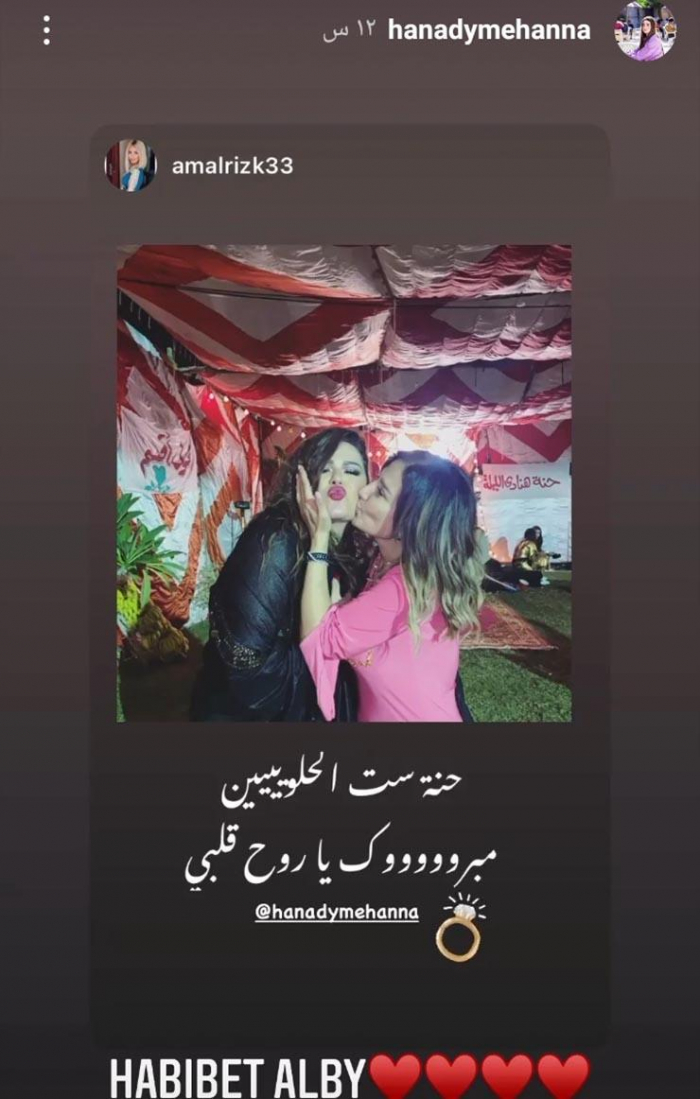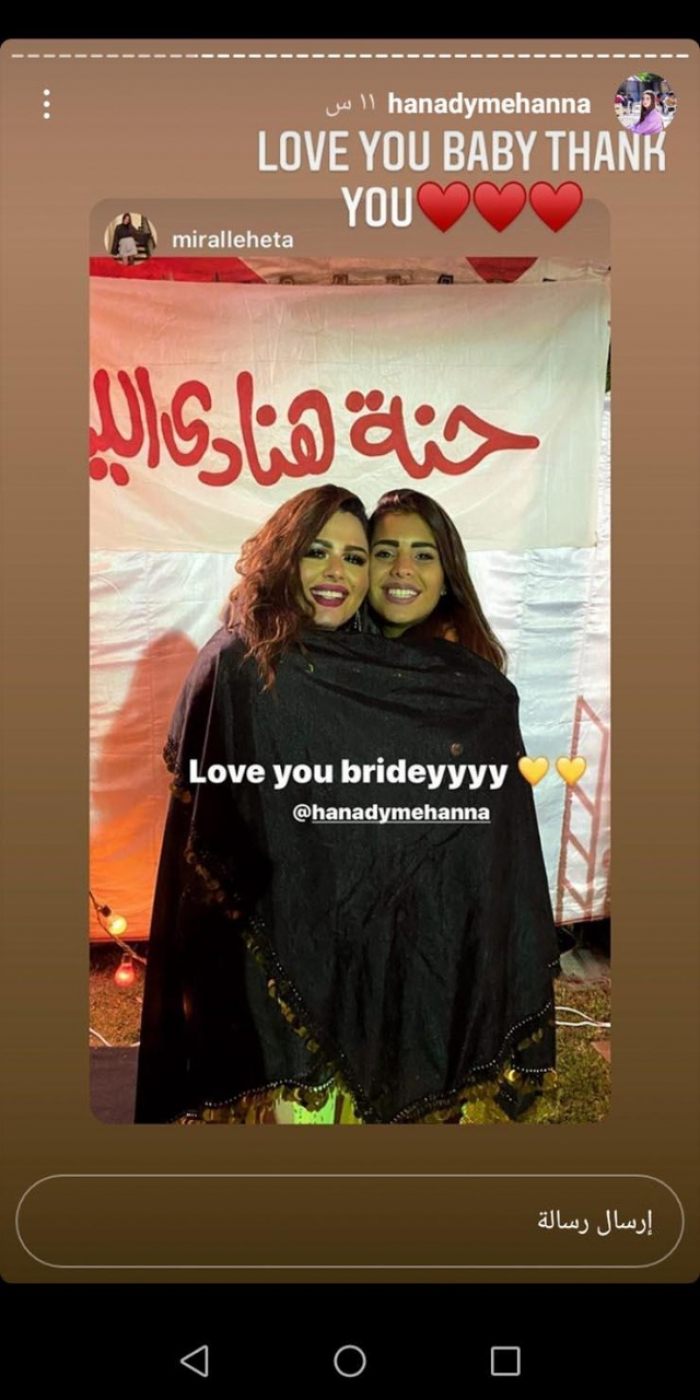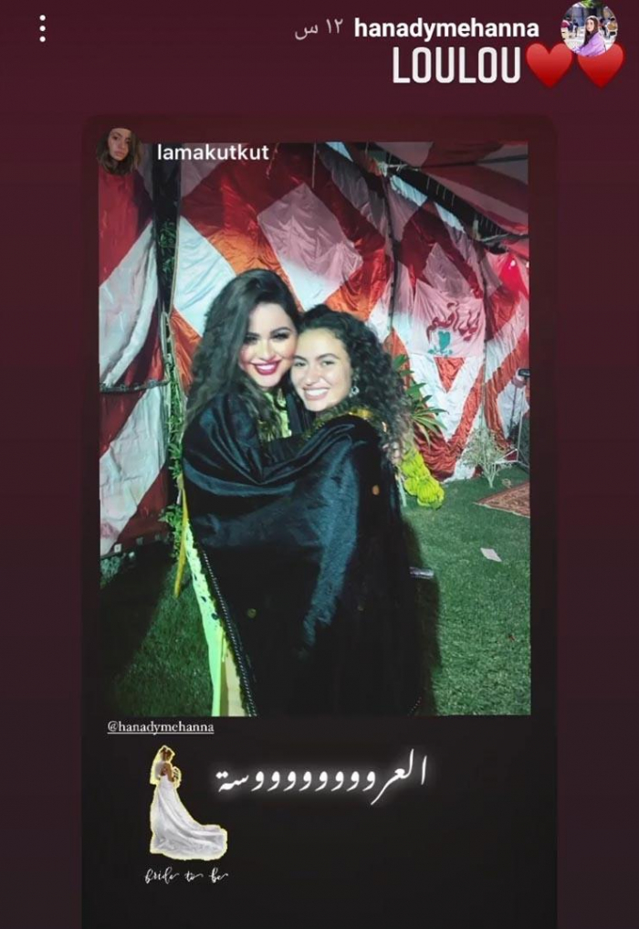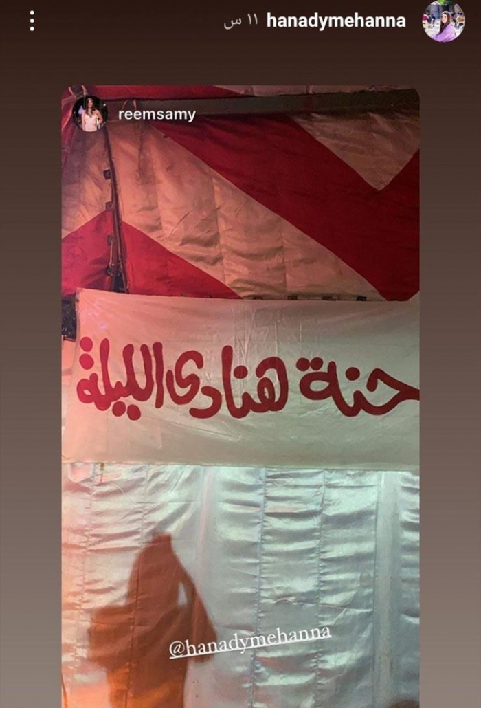 ونشرت هنادي، صورا من ليلة الحنة، عبر خاصية القصص القصيرة على حسابها بموقع إنستجرام، وتضمنت الصور تزيين المكان بأعمدة نور، و"توك توك" ولافتة مدون عليها "حنة هنادي مهنا" وأخرى "حنة هنادي الليلة"، بجانب وجود كمية كبيرة من الورد بجميع أنحاء المكان، ليتحول المكان لليلة حنة على طريقة الأحياء الشعبية.