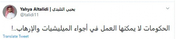 وقال في تغريدة عبر "تويتر" رصدها "المشهد العربي": "الحكومات لا يمكنها العمل في أجواء المليشيات والإرهاب".