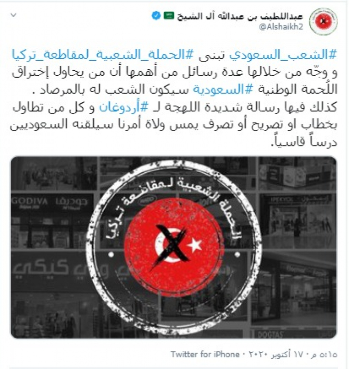 وكتب "آل شيخ" تغريدة عبر تويتر، رصدها "المشهد العربي": "الشعب السعودي تبنى الحملة الشعبية لمقاطعة تركيا ووجّه من خلالها عدة رسائل من أهمها أن من يحاول اختراق اللُحمة الوطنية السعودية سيكون الشعب له بالمرصاد" .
