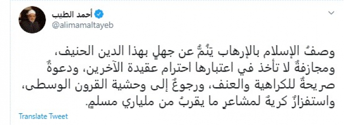 وكتب في تغريدة عبر "تويتر" رصدها "المشهد العربي": "وصفُ الإسلام بالإرهاب يَنُمُّ عن جهلٍ بهذا الدين الحنيف، ومجازفةٌ لا تأخذ في اعتبارها احترام عقيدة الآخرين، ودعوةٌ صريحةٌ للكراهية والعنف، ورجوعٌ إلى وحشية القرون الوسطى، واستفزازٌ كريهٌ لمشاعرِ ما يقربُ من ملياري مسلمٍ".