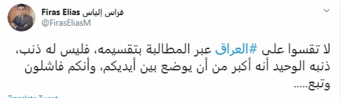 وقال في تغريدة عبر "تويتر" رصدها "المشهد العربي": "لا تقسوا على العراق عبر المطالبة بتقسيمه، فليس له ذنب، ذنبه الوحيد أنه أكبر من أن يوضع بين أيديكم، وأنكم فاشلون وتبع".