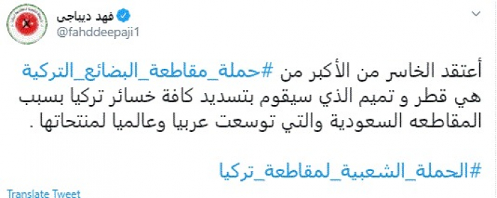 وكتب في تغريدة عبر "تويتر" رصدها "المشهد العربي": "أعتقد الخاسر من الأكبر من حملة مقاطعة البضائع التركية هي قطر وتميم الذي سيقوم بتسديد كافة خسائر تركيا بسبب المقاطعه السعودية والتي توسعت عربيا وعالميا لمنتجاتها".