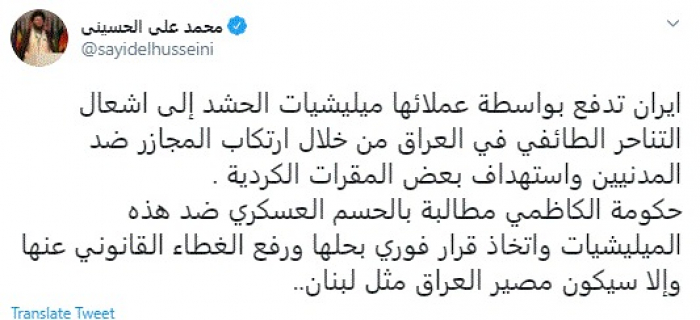 وكتب في تغريدة عبر "تويتر" رصدها "المشهد العربي": "إيران تدفع بواسطة عملائها ميليشيات الحشد إلى إشعال التناحر الطائفي في العراق من خلال ارتكاب المجازر ضد المدنيين واستهداف بعض المقرات الكردية".