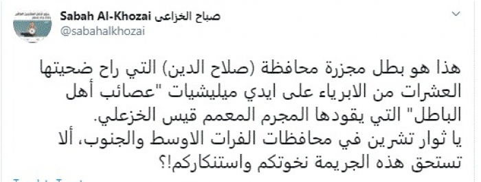 وقال في تغريدة عبر "تويتر" رصدها "المشهد العربي": "هذا هو بطل مجزرة محافظة (صلاح الدين) التي راح ضحيتها العشرات من الابرياء على أيدي مليشيات عصائب أهل الباطل التي يقودها المجرم المعمم قيس الخزعلي يا ثوار تشرين في محافظات الفرات الاوسط والجنوب، ألا تستحق هذه الجريمة نخوتكم واستنكاركم!".