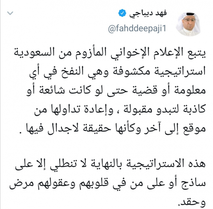 وقال ديباجي عبر حسابه في تويتر ورصدها "المشهد العربي": " يتبع الإعلام الإخواني المأزوم من السعودية استراتيجية مكشوفة وهي النفخ في أي معلومة أو قضية حتى لو كانت شائعة أو كاذبة لتبدو مقبولة ، وإعادة تداولها من موقع إلى آخر وكأنها حقيقة لاجدال فيها".