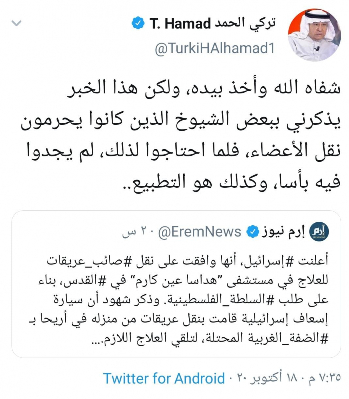 وقال الحمد في تغريدة له عبر حسابه بتويتر ورصدها "المشهد العربي": " شفاه الله وأخذ بيده، ولكن هذا الخبر يذكرني ببعض الشيوخ الذين كانوا يحرمون نقل الأعضاء ولما احتاجوا لذلك، لم يجدوا فيه بأسا، وكذلك هو التطبيع".