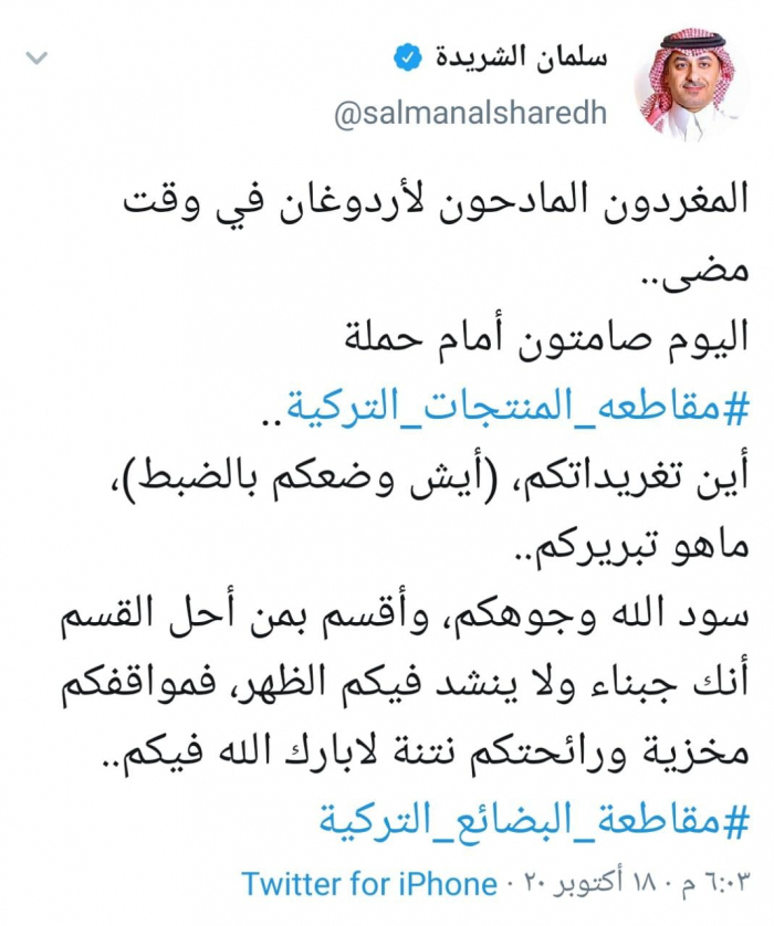 تساءل الإعلامي السعودي سلمان الشريدة، عن سر اختفاء المغردين المادحين في الرئيس التركي رجب طيب أردوغان، وسبب صمتهم أمام حملة مقاطعة المنتجات التركية.