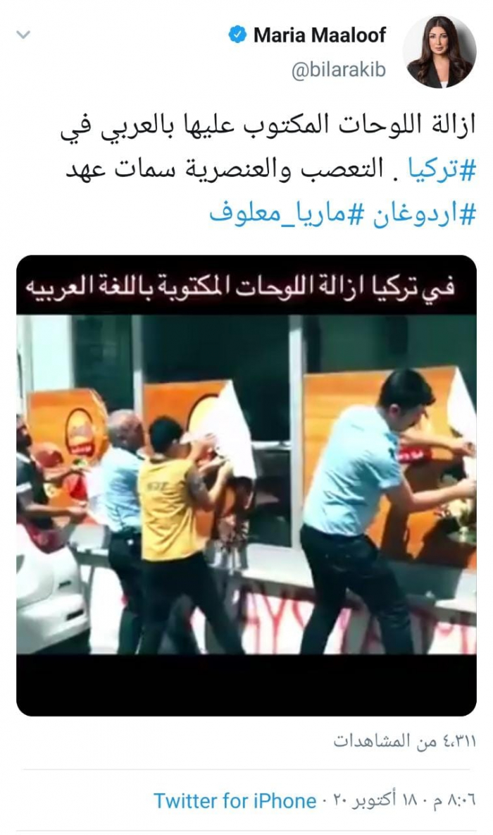 وعرضت معلوف في تغريدة لها عبر حسابها في "تويتر" ورصدها "المشهد العربي مقطع فيديو وعلقت عليه بقولها": "إزالة اللوحات المكتوب عليها بالعربي في تركيا، التعصب والعنصرية سمات عهد أردوغان".