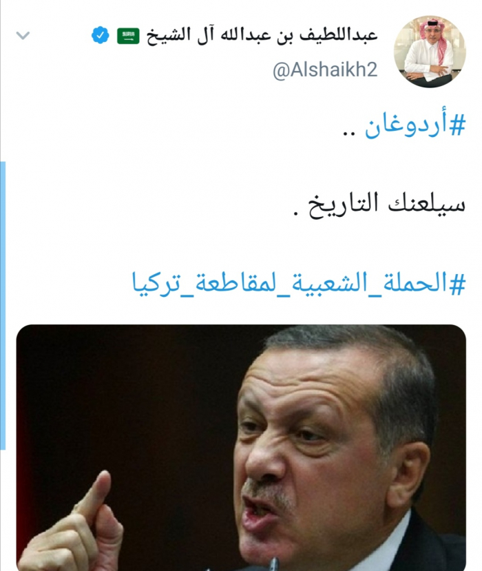 وكتب "أل شيخ" تغريدة عبر تويتر، رصدها "المشهد العربي": "أردوغان .. سيلعنك التاريخ"، مدونا هاشتاج #الحملة_الشعبية_لمقاطعة_تركيا.