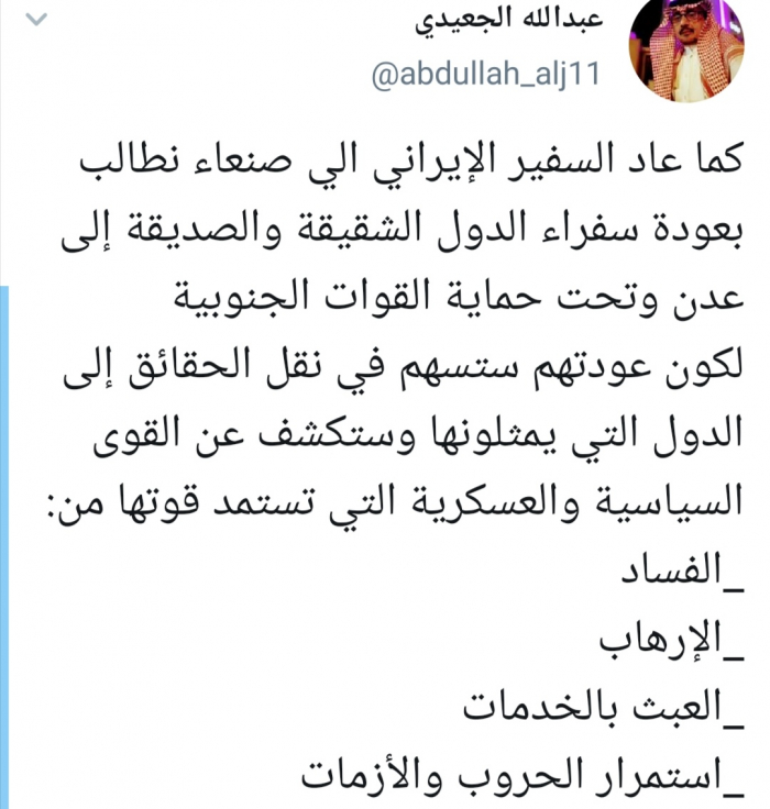 طالب الشاعر عبد الله الجعيدي، بعودة سفراء الدول الشقيقة والصديقة إلى عدن وتحت حماية القوات الجنوبية مثلما عاد السفير الإيراني إلى صنعاء.
